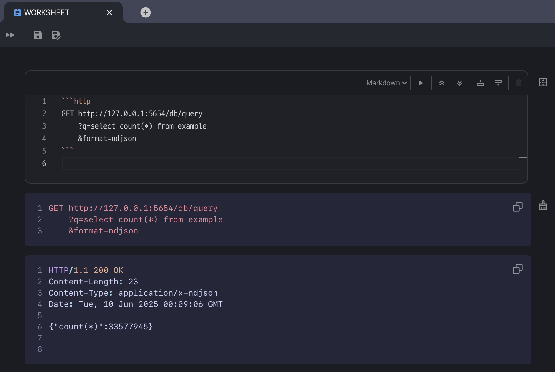 machbase-neo 웹 UI에는 REST API 클라이언트가 내장되어 있어 아래 예시처럼 워크시트의 마크다운이나 TQL에서 바로 HTTP API를 테스트할 수 있습니다.