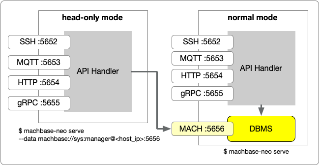 이 모드에서는 machbase-neo 프로세스가 자체 데이터베이스 없이 실행되고 대상 데이터베이스를 그대로 사용합니다. “헤드 온리 machbase-neo"는 5656 포트를 제공하지 않으며, 나머지 API는 모두 대상 DBMS와 연동됩니다.
