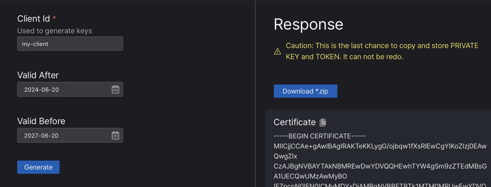 “Generate” 버튼을 누르면 해당 클라이언트용 키 파일이 생성됩니다.