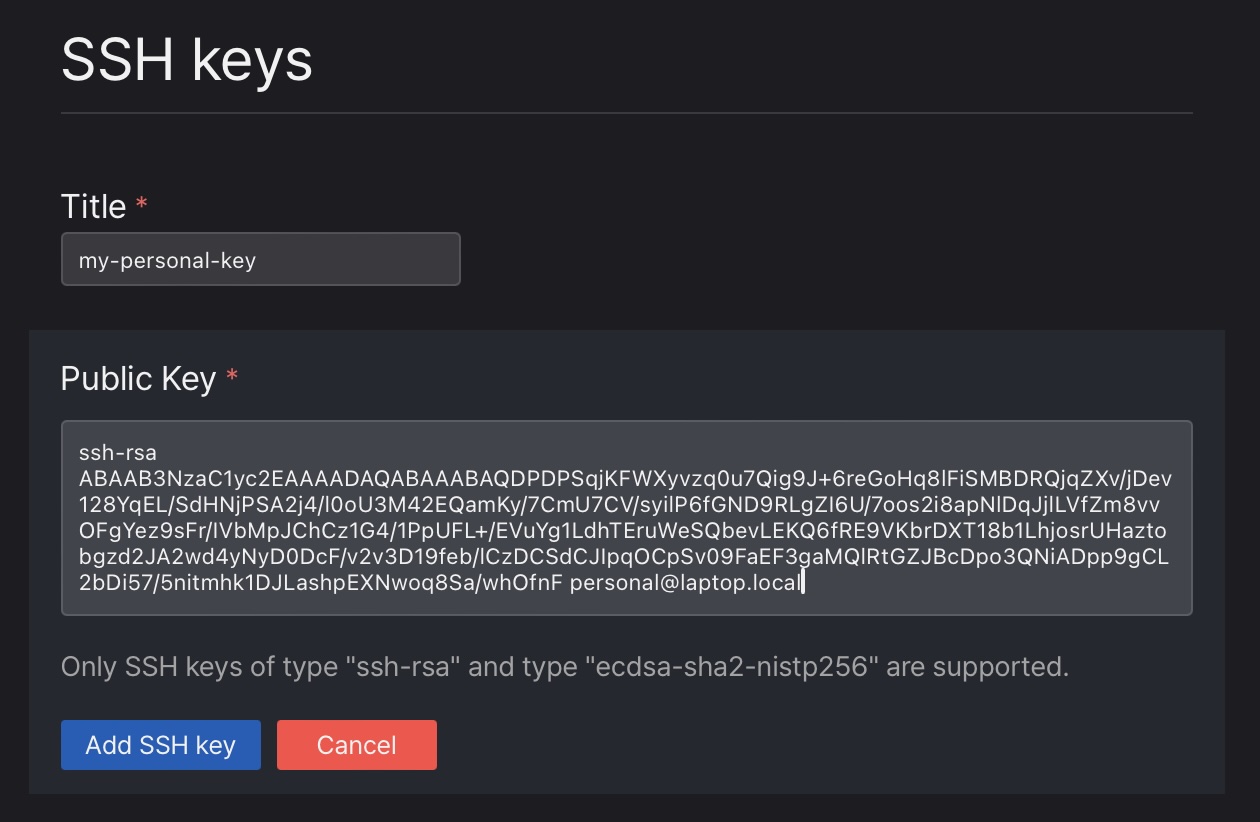 - “New SSH Key” 버튼을 클릭하고 공개키를 입력한 뒤 제목을 지정합니다. 마지막으로 “Add SSH Key” 버튼을 눌러 등록을 완료합니다.