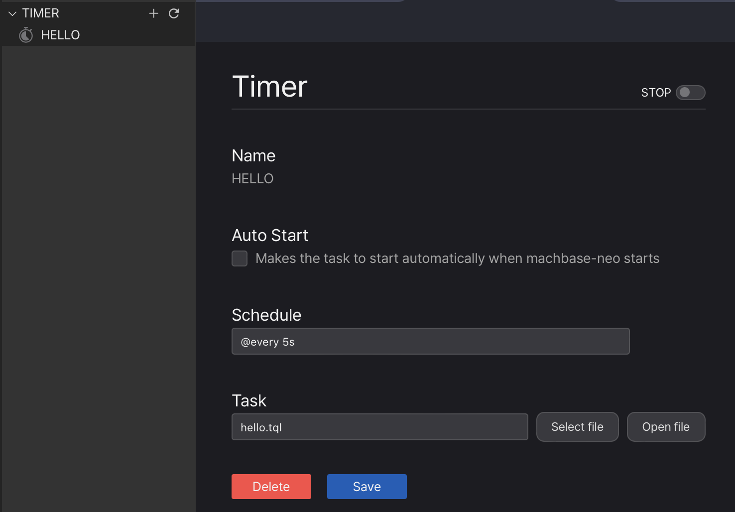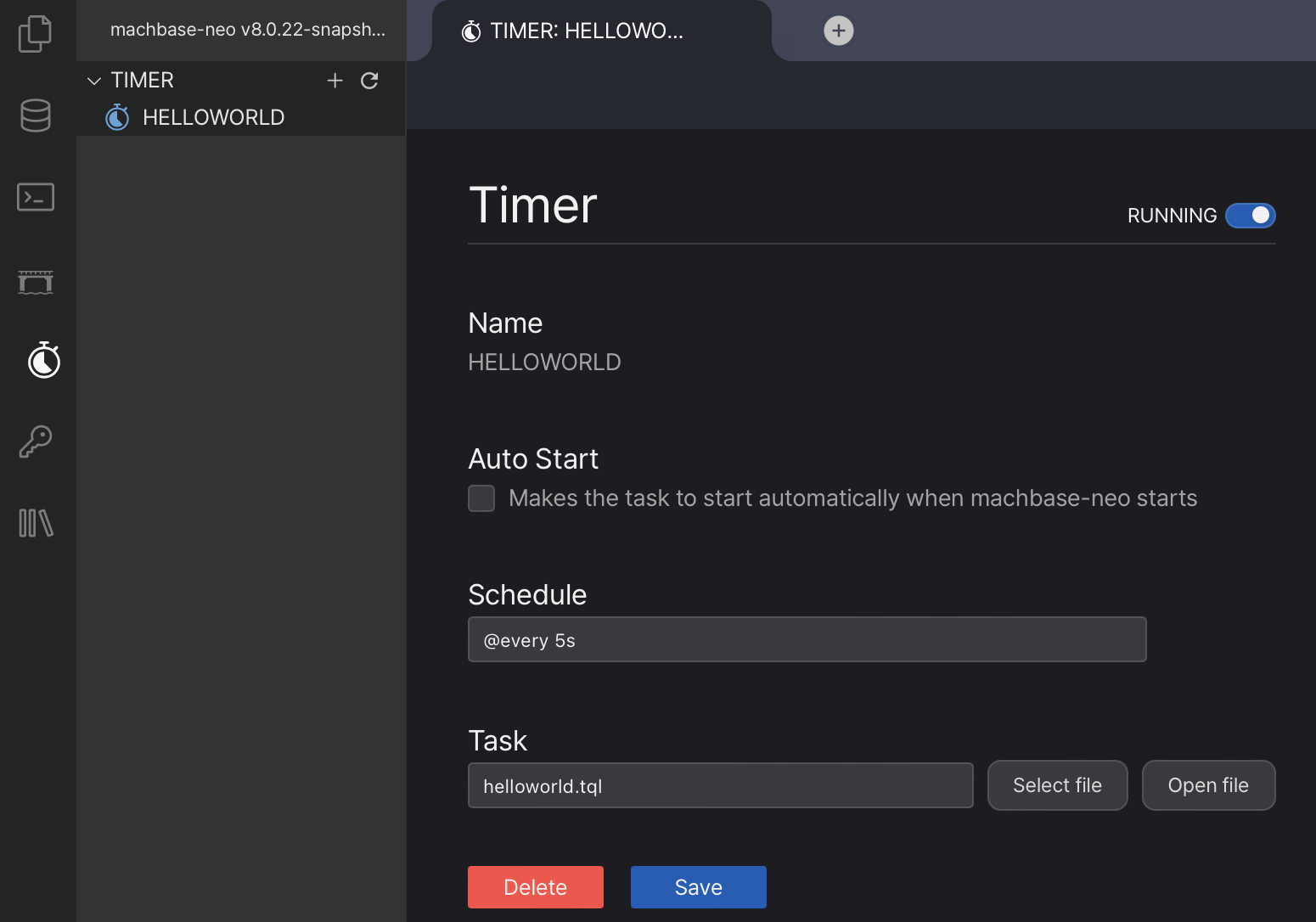 │ HELLOWORLD │ @every 5s │ helloworld.tql │ false │ RUNNING │
