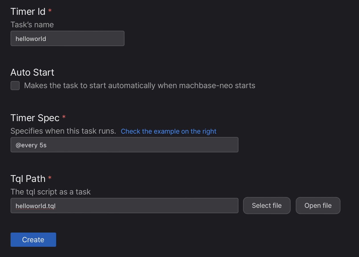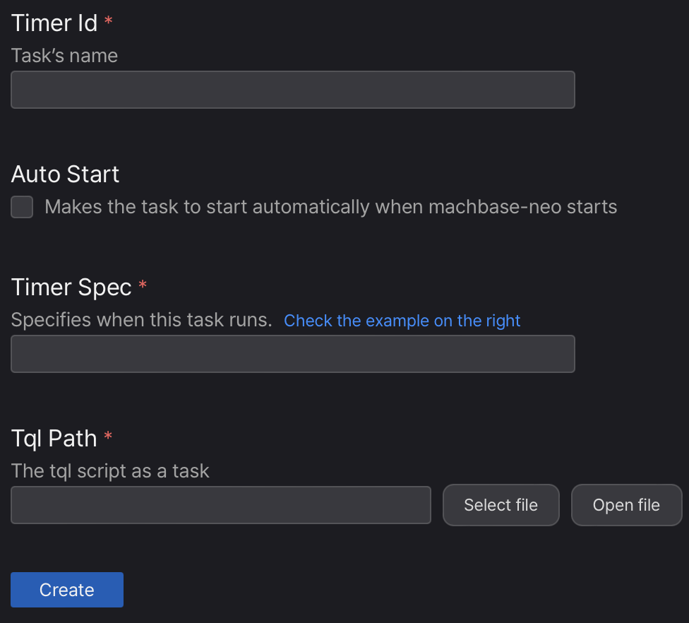 타이머 ID(이름), 스케줄(Timer spec), 실행할 TQL 경로를 입력합니다.