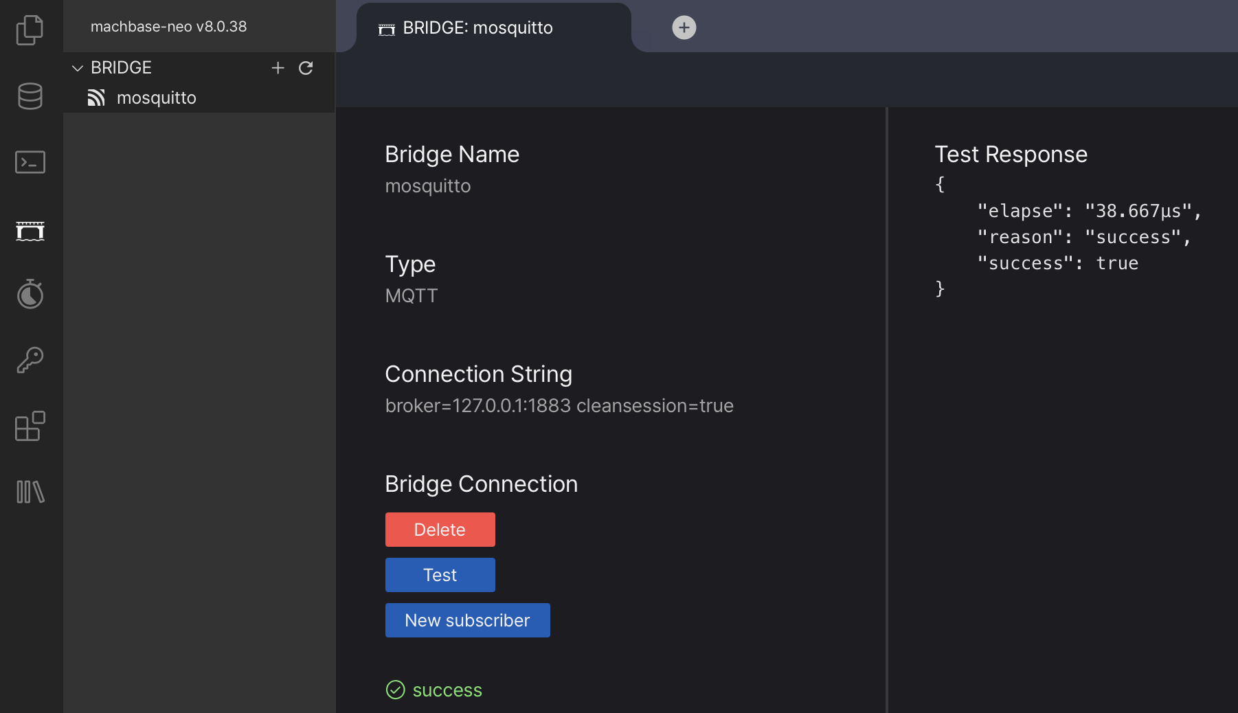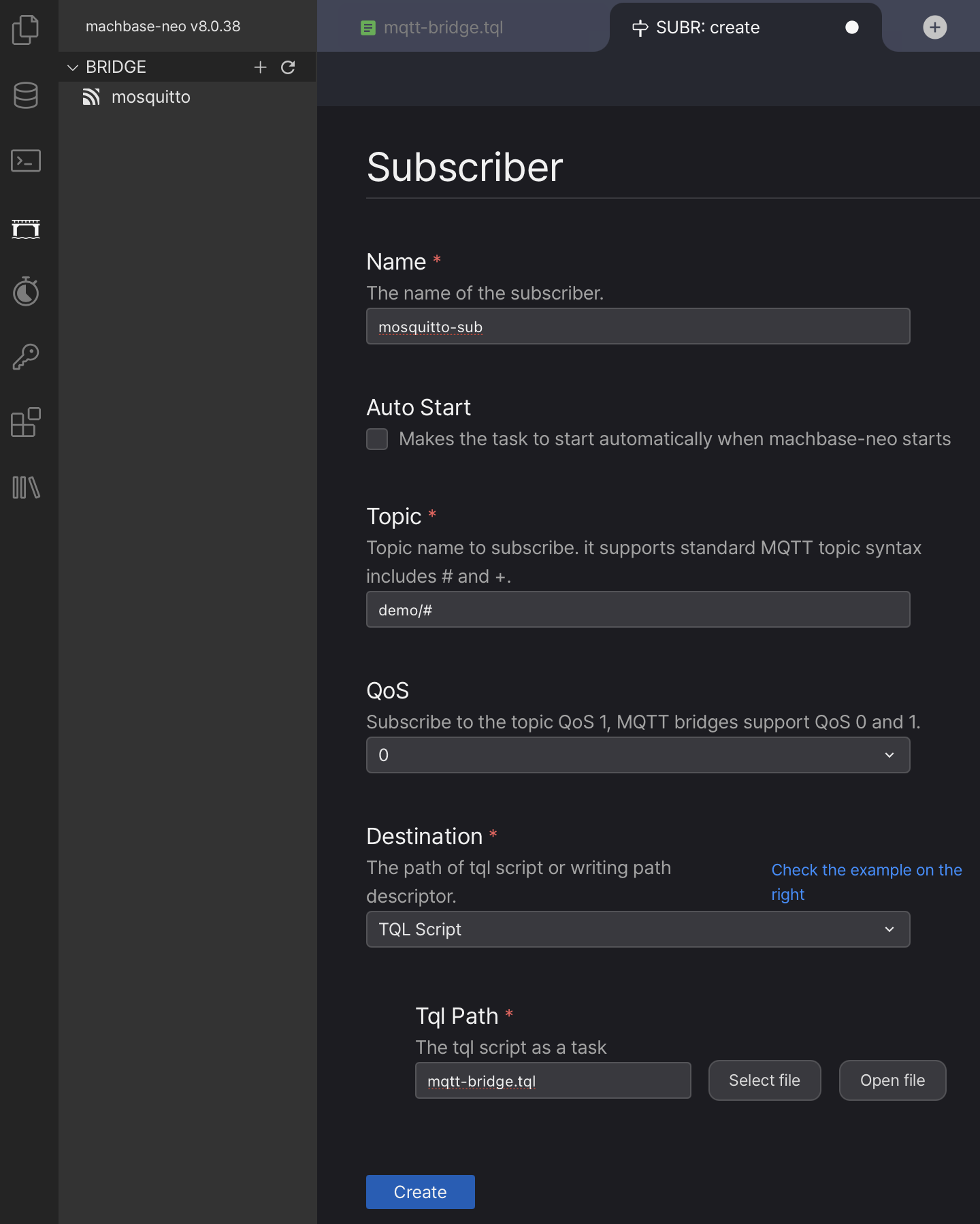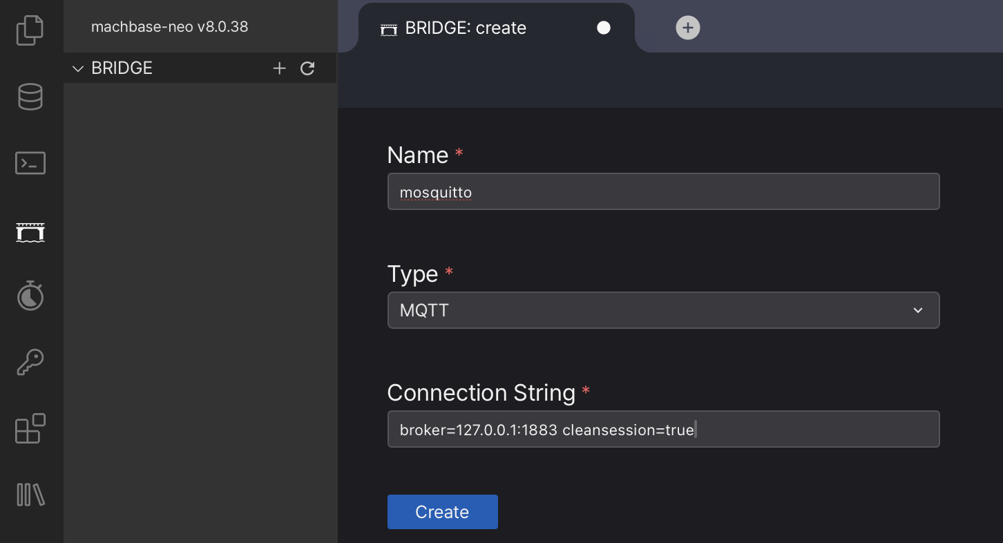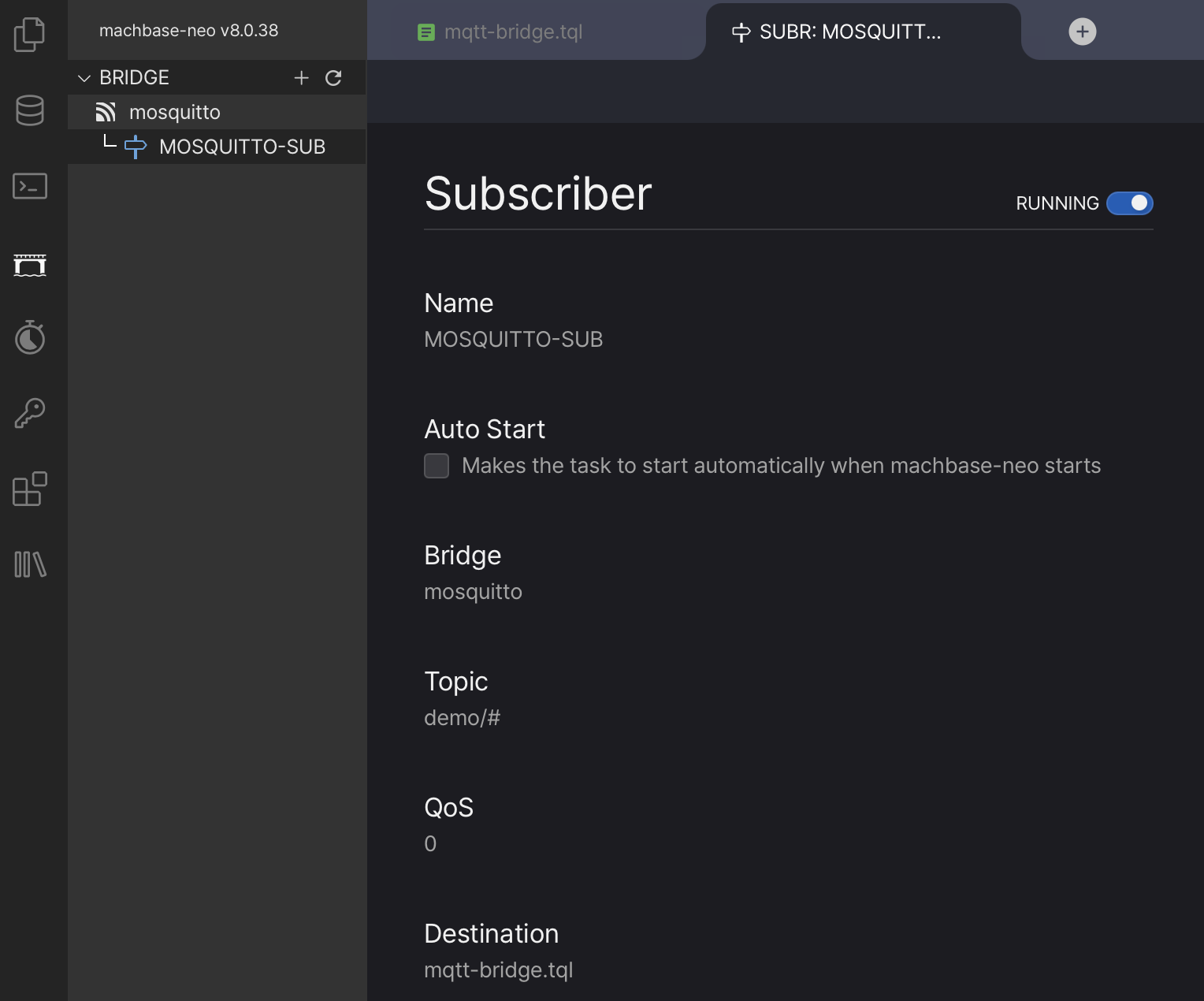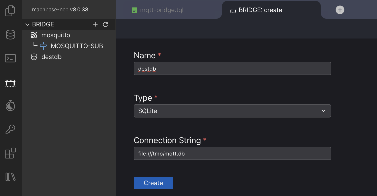 이제 machbase-neo에 MQTT 브리지 “mosquitto"를 등록합니다.