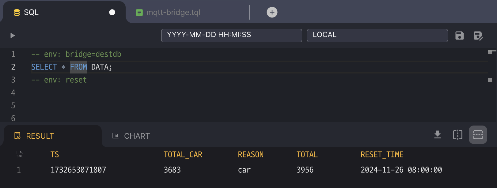 데이터가 대상 데이터베이스에 저장되었는지 확인합니다. machbase-neo의 SQL 에디터에서 -- env: bridge=destdb