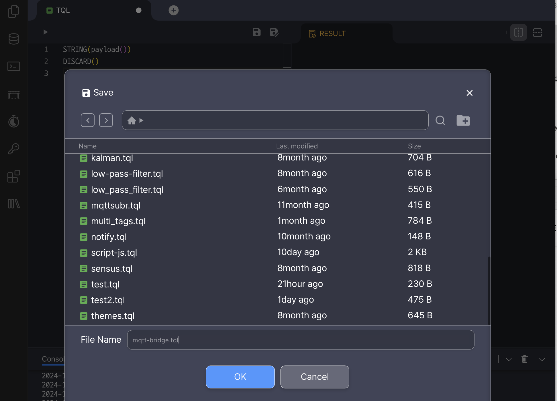 외부 MQTT 브로커에서 들어오는 메시지를 처리할 TQL 파일을 만듭니다. 현재 스크립트는 메시지 페이로드를 받아 버리는 최소한의 동작만 수행합니다.